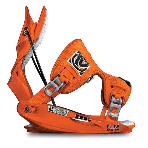 - Flow M9-SE 2012 Orange Snowboard Bindings : The M9-SE is supercharged to make sure you and our team riders stay on top of their game, no matter where, when, or what is being shredded. The SnugFit molded baseplate delivers a precise connection between boot and binding, and the 30% fiber-reinforced DuPont Zytel Nylon channels power effi ciently to the board. The three piece modular hiback has an Aluminum heelcup to stay in control, but a low-durometer TWEAK.6 SupportPanel for a softer flex in the top-zone, allowing maximum fl exibility, and which can rotate medially or laterally for dialing in a custom feel. The I-Flex PowerStrap with deep side cutouts provides ideal flex for freestylers and all-mountain riders, while the 3D-shape gives a direct boot-to-binding-to-board feel for those powerful toeside turns. 2 lateral Airframe MINIratchets allows you to adjust the footstrap to individual preferences while toolless medial course adjustment eliminates excess weight. SLA maintains PowerTriangle geometry at every setting and allows hiback rotation, and adjustable toeramps and EVA landing pads add all the cushioning and dampening you need.
